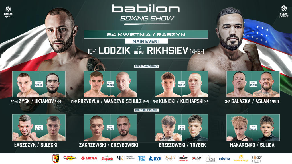 Babilon Boxing Show w Raszynie – Lodzik, Zyśk, Przybyła i Kunicki w ringu Już w piątek 24 kwietnia w Centrum Sportu Raszyn odbędzie się kolejna gala spod szyldu Babilon Boxing Show. Kibice zobaczą na niej pojedynki w boksie zawodowym i olimpijskim. W walce wieczoru Jan „Iron” Lodzik (10-1, 2 KO) zmierzy się z doświadczonym Jamshidem […]